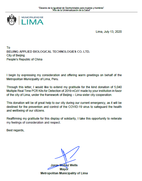 On July 13, Mayor of Lima Jorge Mu?oz Wells sent a letter of appreciation to Beijing Applied Biological Technologies Co., Ltd., thanking the company for its donation and support in Peru's fight against COVID-19.