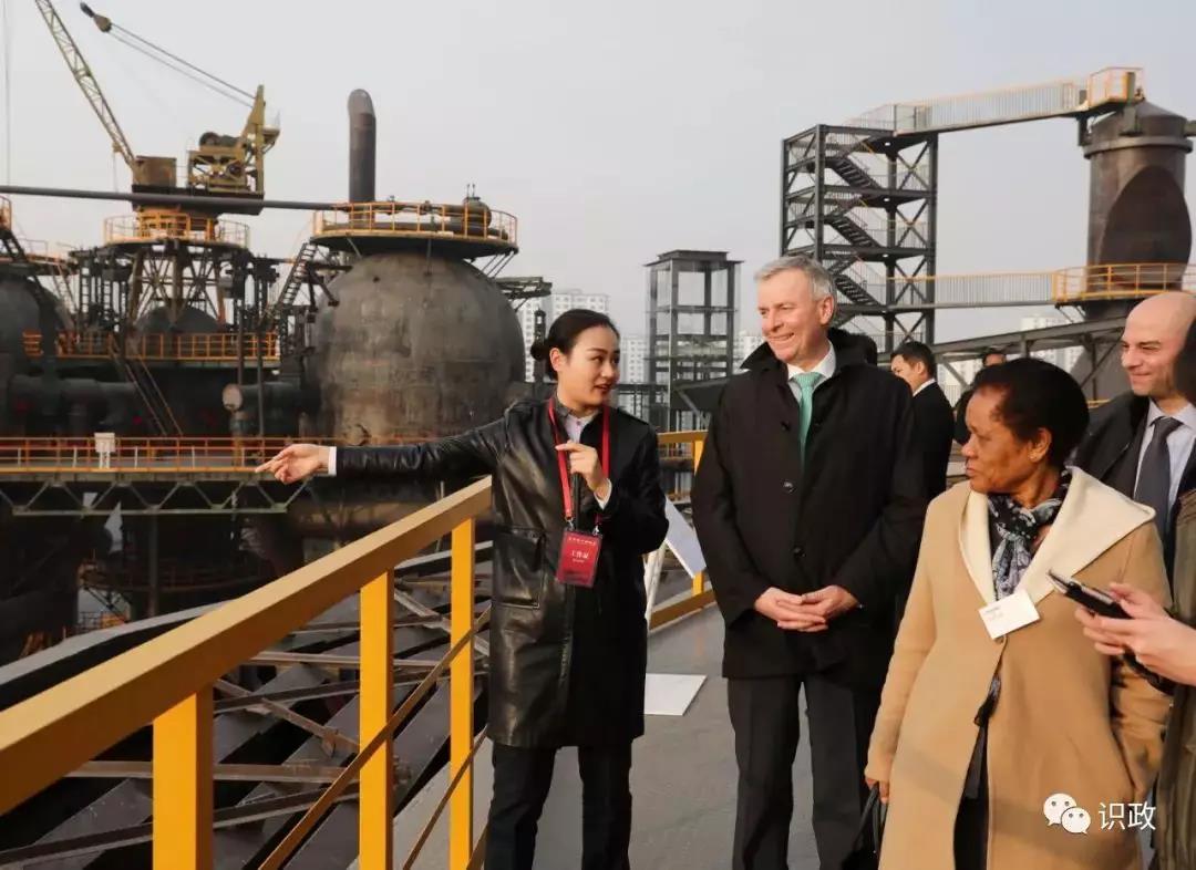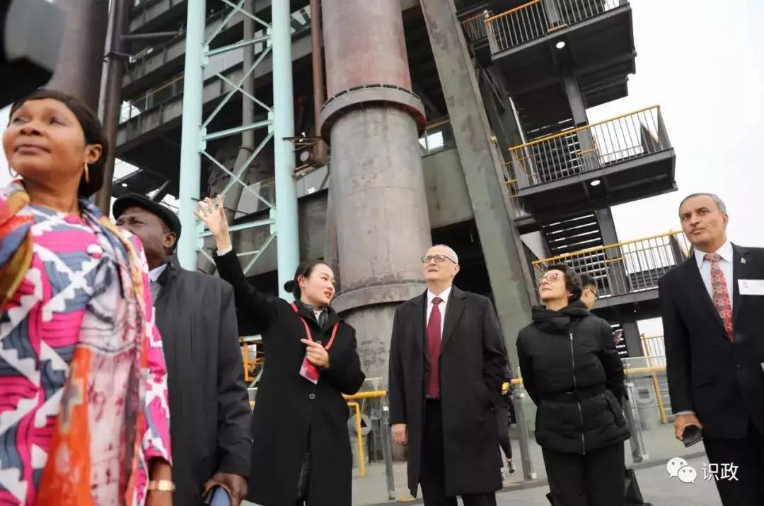 乘電梯登上高約40米的昔日煉鋼高爐,視野頓時開闊起來,整個廠區一覽無遺。在翻譯的介紹下,有人饒有興致地了解起規劃中的首鋼滑雪大跳臺,那里背靠原首鋼電力廠冷卻塔,北望石景山,東倚群明湖,西臨永定河,是2022年北京冬奧會唯一一個位于市區內的雪上項目舉辦地。還有人對位于園區北部的工業遺址公園片區產生濃厚興趣。當得知這里將建設首鋼博物館,用以再現曾經的“鋼鐵記憶”,來自加拿大的一位使節連聲說好,因為擁有歷史文化內涵才能讓一片區域永葆活力。