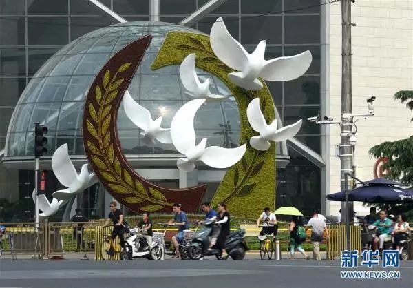 在西單西北角,以和平鴿飛躍橄欖枝為主景的“合作共贏”花壇,體現了良好的中非合作將為全世界的和平、穩定和發展注入正能量。