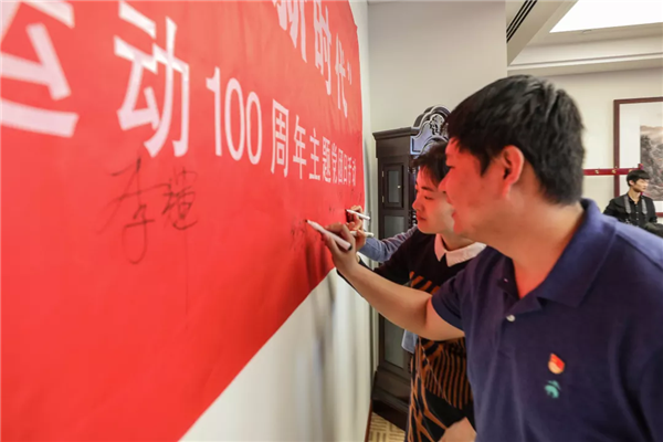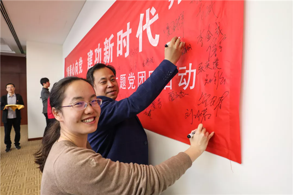 在《光榮啊,中國共青團》激昂的歌聲中,參加座談會的青年干部代表和來賓在“青春心向黨 建功新時代”的橫幅上簽下自己的名字,宣誓奮斗的青春。
