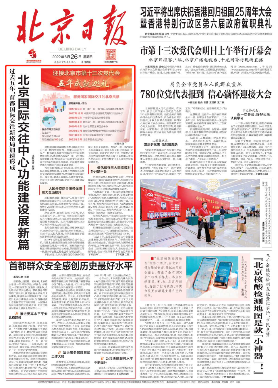 6月26日,市第十三次黨代會召開前夕,北京日報頭版刊載文章《過去五年,首都國際交往新格局加速形成 北京國際交往中心功能建設展新篇》。過去5年間,北京以服務首都發展為統領,全面提升中國特色大國外交綜合服務保障能力,持續做優國家級對外開放平臺,加速匯聚國際高端資源要素,書寫出亮點紛呈的國際交往中心功能建設新篇章。