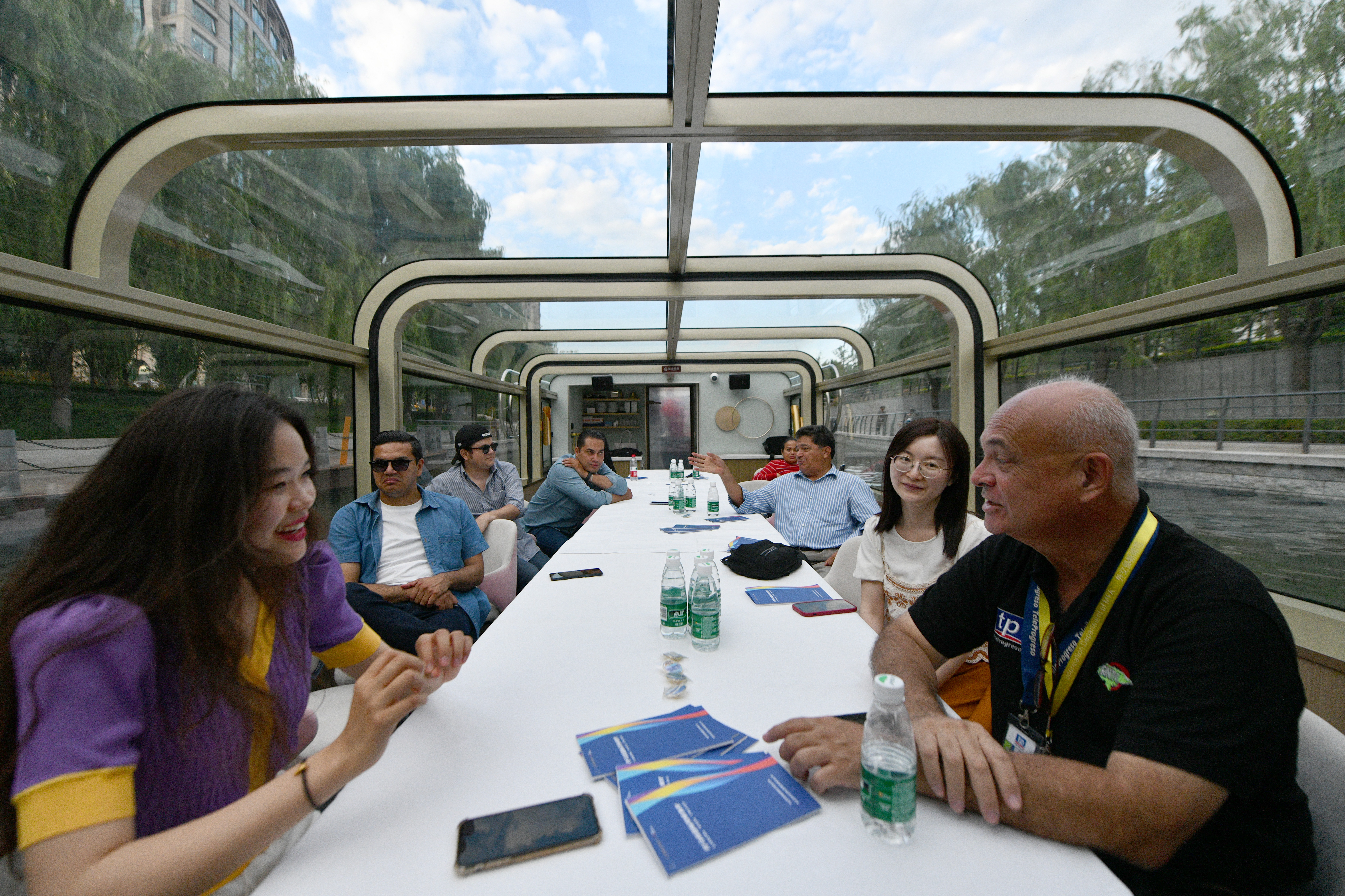 落日余暉下的亮馬河別具風情。洪都拉斯記者們乘船夜游,命運共同體廣場、貝殼劇場等沿途景觀次第映入眼簾,各具特色的跨河橋與水中倒影交相輝映,猶如一幅唯美動人的畫卷。晚風習習,記者們一邊賞景,一邊用手機拍攝照片和視頻。