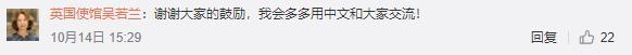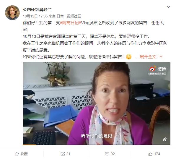 前不久,英國新任駐華大使吳若蘭(Caroline Wilson)抵達北京開始任期,12日,她在個人微博上發布消息說,回到了官邸開始為期14天的隔離。隔離期間,她用中文錄制了隔離日記Vlog,大贊中國的防疫措施和衛生人員專業。