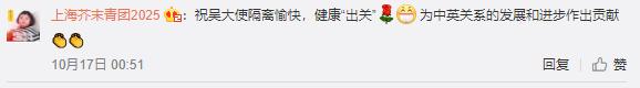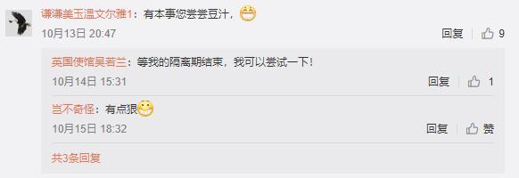 她也在微博留言欄跟網友互動,表示自己會努力學好普通話,準備等隔離結束嘗試北京小吃“豆汁”。