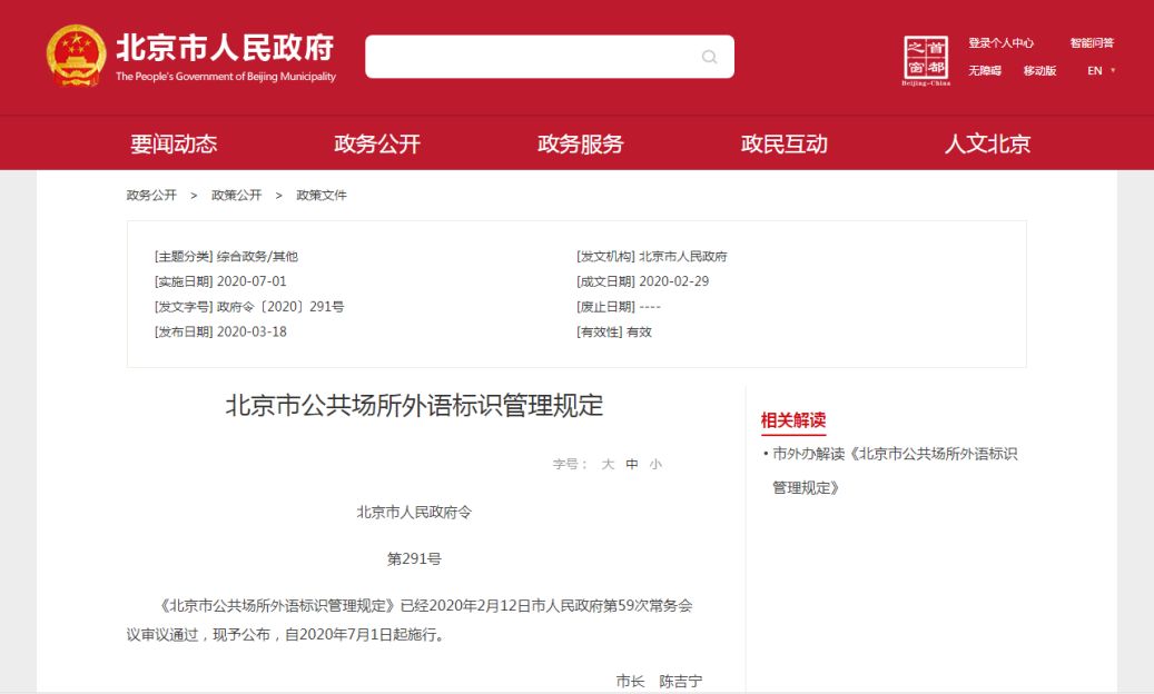 為深入推進北京國際交往中心功能建設,提升城市國際化水平,2月12日,市人民政府第59次常務會議審議通過《北京市公共場所外語標識管理規定》。3月18日,《規定》以政府令形式正式發布,自2020年7月1日起施行,為我市規范公共場所外語標識管理提供依據。