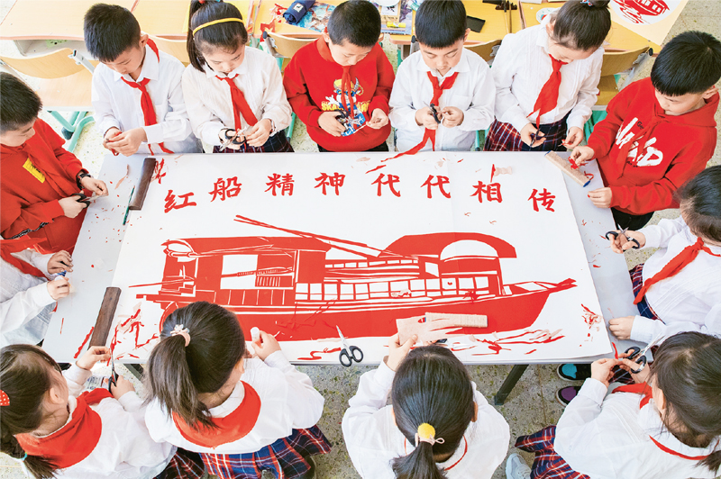 圖為內蒙古呼和浩特市恒昌店巷小學開展“紅船精神代代相傳”主題教育活動,通過制作紅船剪紙作品、講述紅船故事等豐富多彩的形式,教育孩子們知史愛黨、知史愛國。 (人民圖片 丁根厚/攝)