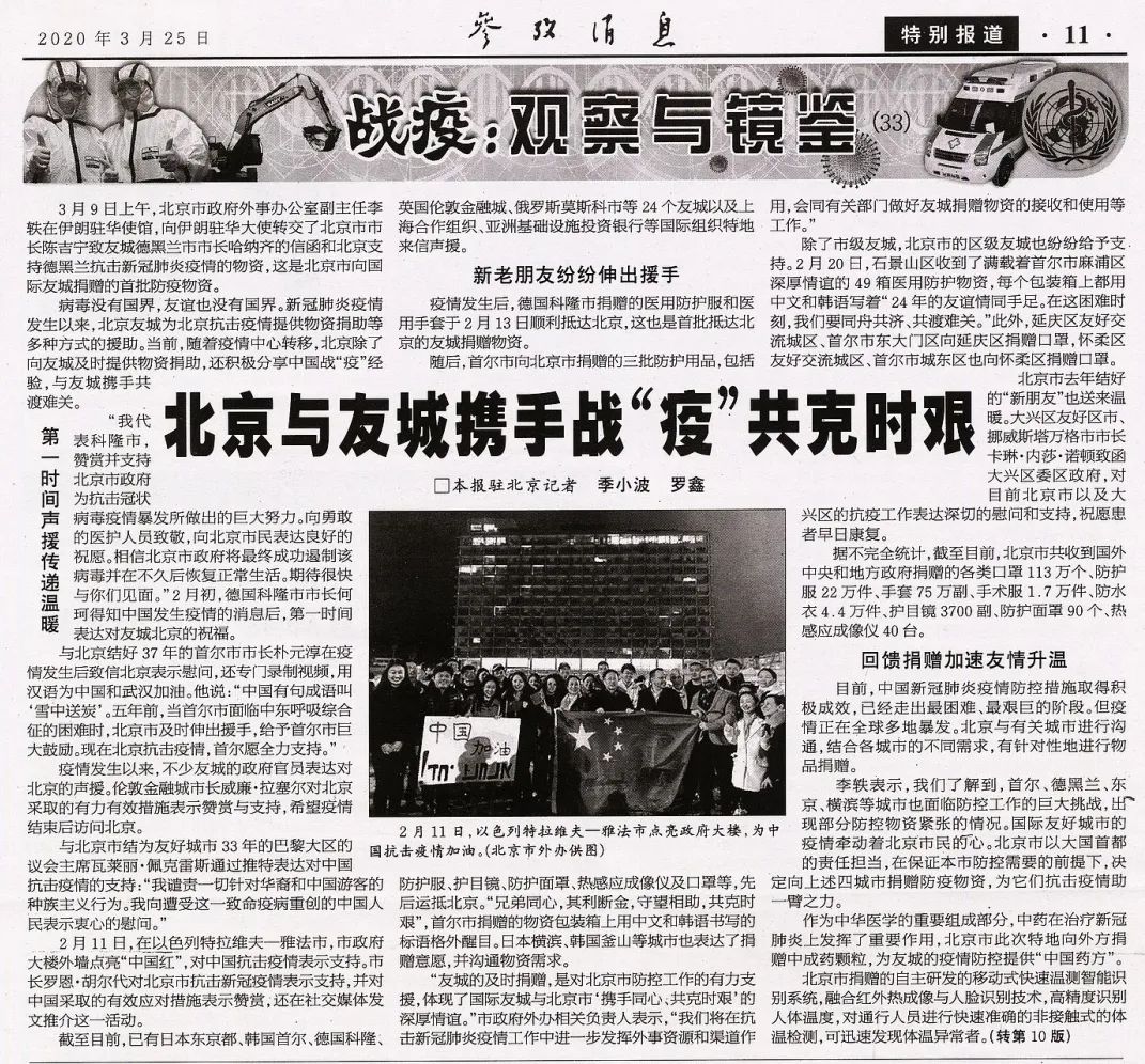 病毒沒有國界,友誼也沒有國界。3月25日,《參考消息》特別報道版刊發《北京與友城攜手戰“疫”共克時艱》,詳細介紹了疫情發生以來北京與國際友好城市守望相助、共同抗“疫”的感人故事,以實際行動續寫了構建人類命運共同體的友好城市篇章。